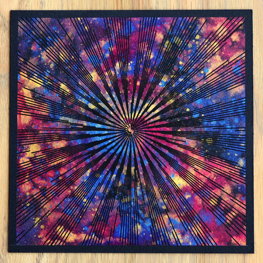An original metallic red, blue and gold painting with a feel of hyperspace travel! Painting made by hand using Aero inks painted on 300lb black watercolor paper by Aqua Stonehenge. Generative design drawn with my AxiDraw pen plotter and Posca paint pens. This is an original painting and pen plot!